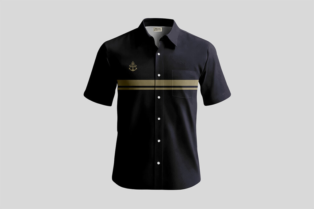 For Arcane & Anchor, the identity moves from the digital space into tactile reality through high-contrast apparel and sophisticated retail packaging. By utilizing horizontal gold banding reminiscent of nautical rank stripes across apparel and shopping bags, we created a recurring geometric motif that is instantly recognizable. Every touchpoint, from the hang-tags on a polo to the signage above the flagship store, is designed to reinforce the premium, structured nature of the brand. experience that feels as structured and engineered as the pitmaster’s process itself. Every touchpoint from the weighted feel of the menu to the ‘Taste the Flame’ seal on the box is designed to reinforce the premium, industrial nature of the Meridianville smokehouse.