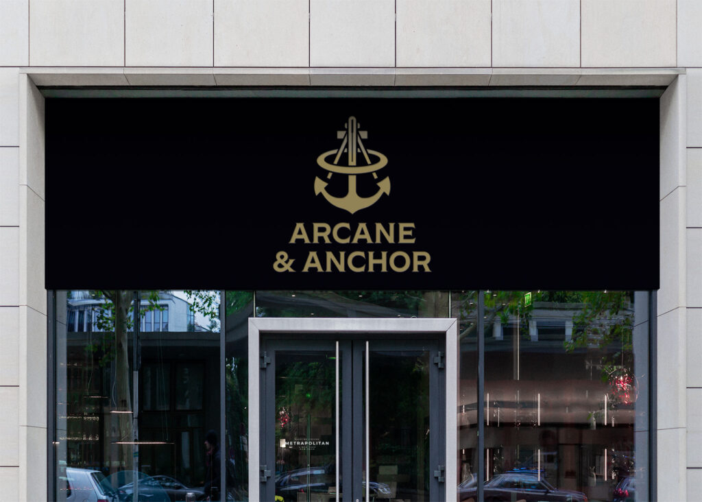 The identity for Arcane & Anchor is built on a foundation of technical elegance. Rather than leaning into distressed textures or seafaring clichés, we opted for a clean, gold-on-black palette that suggests a premium, engineered quality. The primary logo, a stylized anchor combined with a sextant, represents the brand’s core values: stability and craftsmanship. By pairing a blocky, authoritative sans-serif typeface with a minimalist emblem, we created a mark that feels equally at home on a custom-tailored shirt or a heavy-duty industrial shipping container.